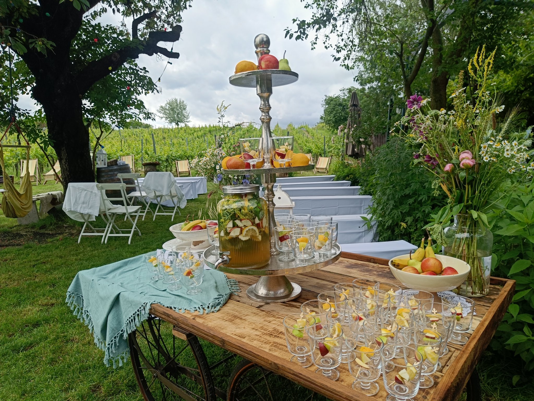 * Gartenflächen mit Kaffee- und Stehtischen, Hängematten und Liegestühlen & der Weinberg zum Spazieren